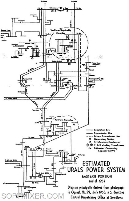 Когда на панно определилось положение Полевского, стала ясной структура сети электропередач южного и восточного Урала. Аргаяшская ТЭЦ (с ее, как стало видно, семью турбинами) была идентифицирована как большой прямоугольник выше и левее Шагольской подстанции. Обеспечение Кыштымского реактора электрической и тепловой энергией было в основном с этой ТЭЦ, с резервом в виде всех ближайших электростанций на севере, юге и западе.