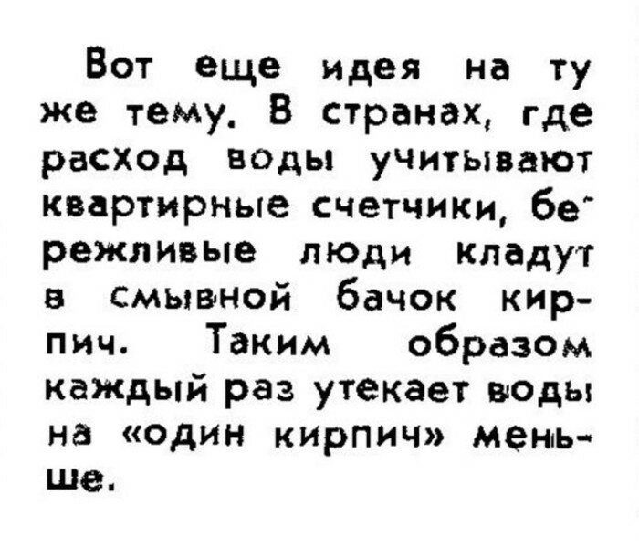 сейчас в европе популярны сливные бачки с 2-мя кнопками. первая — сливает его весь, вторая — половину. экономят так сказать без кирпича))) ну и мухобойку в виде ракетки можно купить с кнопкой — типа шокер для мухи.