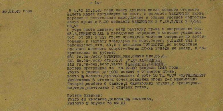 Семнадцатого-двадцатого февраля дивизия вела тяжёлые бои за город Заллентин. Её противником была 10-я танковая дивизия СС «Фрундсберг».