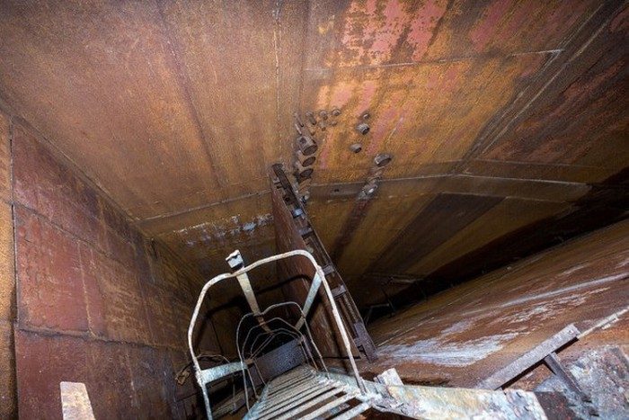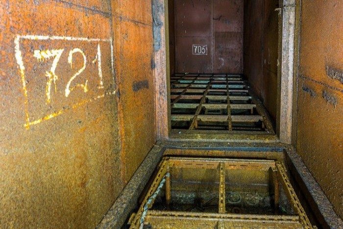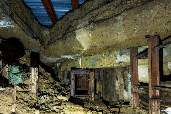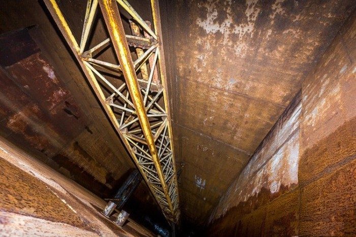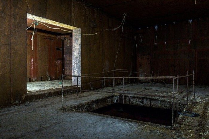 Луч фонаря выхватывает в темноте глубокие шахты, о назначении которых можно только догадываться. Брошенный вниз камень летит почти 4 секунды и еле слышно плюхается в воду. Нижние уровни бункера затоплены.