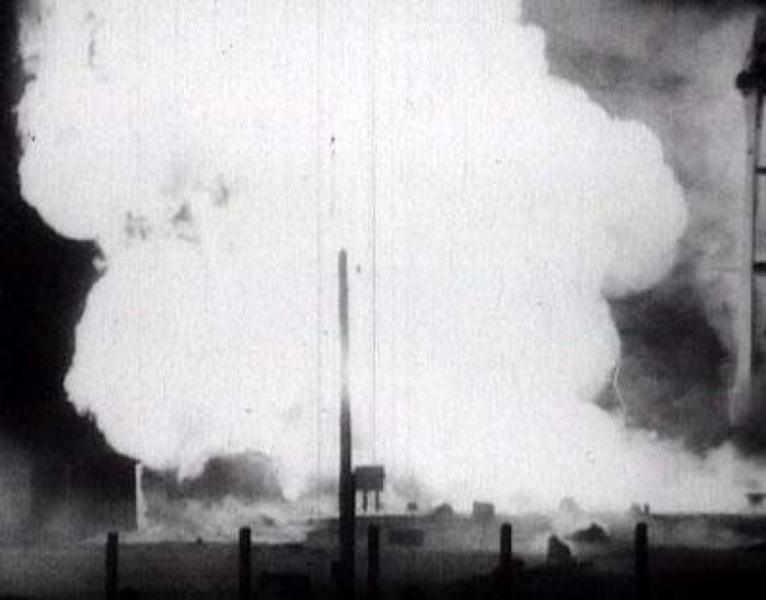 Кинокамеры запечатлели ужасающую картину: от ракеты кругами расходились волны пламени, пожирая все на своем пути, из огня выскакивали и разбегались во все стороны горящие, как факелы, люди. Некоторые добегали до ограды из колючей проволоки и безжизненно повисали на ней.