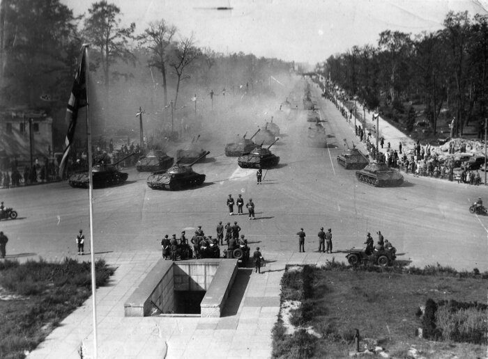 Дело в том, что советское командование не упустило возможности превратить прохождение отечественной бронетехники в рамках берлинского Парада Победы в демонстрацию превосходства русской бронетехники.