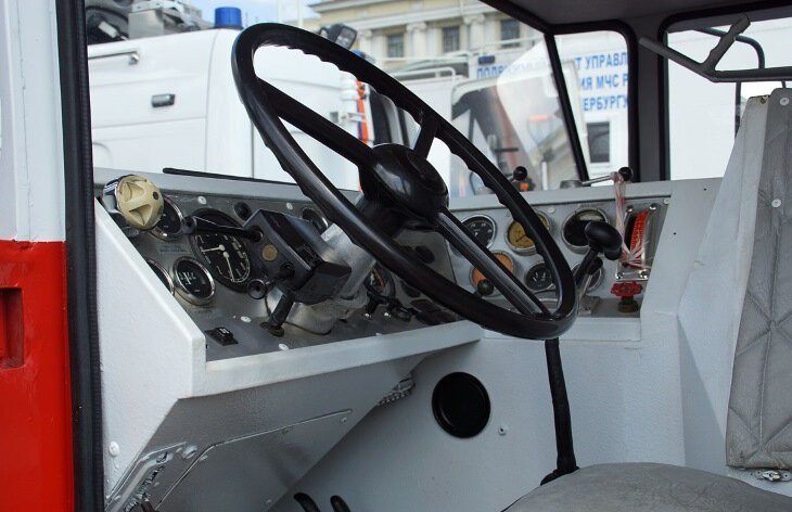 «Баранка» ЗИЛа сочетается с импортным подрулевым переключателем, рулевая колонка буквально «протыкает» приборную панель. Создатели кабины разумно решили поставить стрелочные приборы, предназначенные для контроля систем автомобиля на переднюю, а для контроля систем пожаротушения – на боковую панель приборов.