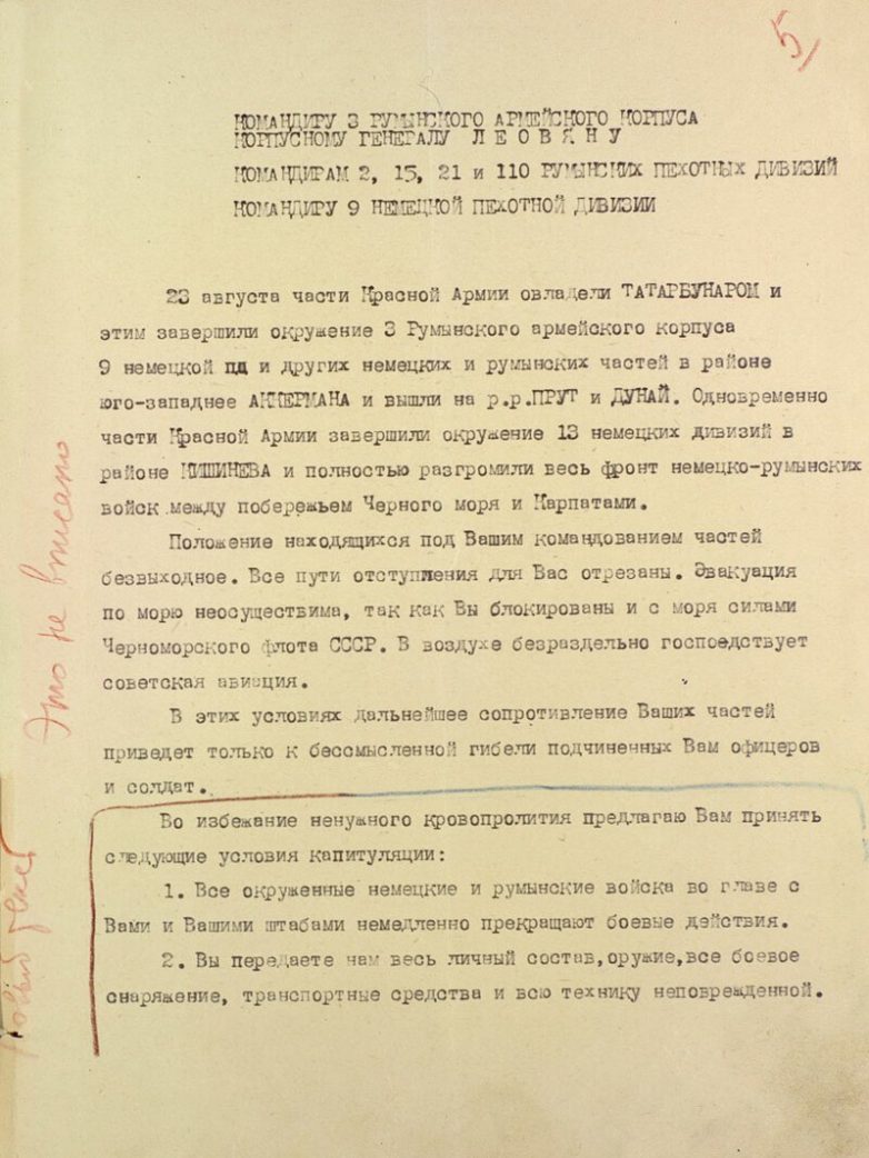 Но наибольший интерес представляет ранее не публиковавшийся ультиматум генерала Толбухина третьей румынской армии и 9-й немецкой дивизии.