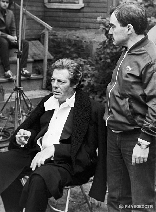 Марчелло Мастрояни и Александр Адабашьян на съёмках совместного советско-итальянского фильма „Очи черные“. 1986 год /РИА Новости/