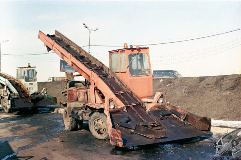Интересно, что лаповые снегопогрузчики в СССР существовали не только на пневмоколесном, но и на гусеничном ходу. Пример такой конструкции, смонтированной на основе трактора ДТ-54, показан на фото выше. Судя по виднеющейся на стреле табличке, называется эта штука как-то типа ПНД-2,5. Но где конкретно она выпускалась (и выпускалась ли вообще серийно) – не знаю.