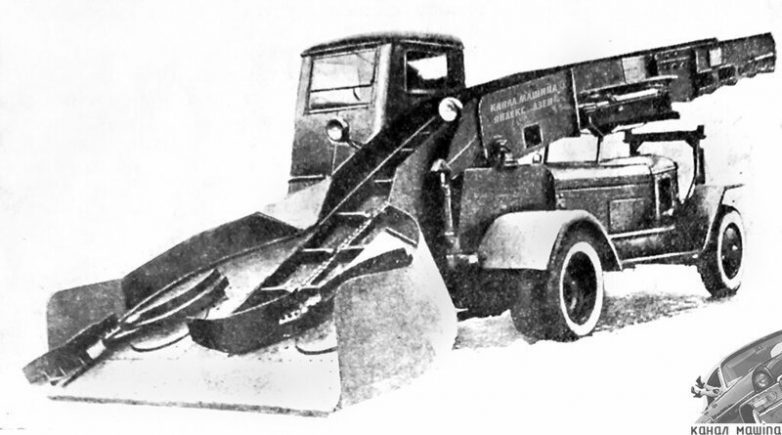 Снегопогрузчики в СССР начали делать еще в 1930-е годы, однако привычными «тёщиными ручками» они еще не являлись: снег в них захватывался и подавался на транспортерную ленту посредством фрез.