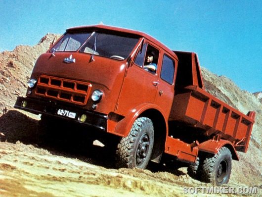 МАЗ-525 в сцепке со специально разработанным в Свердловске самосвальным прицепом мог перевозить груз до 65 тонн.