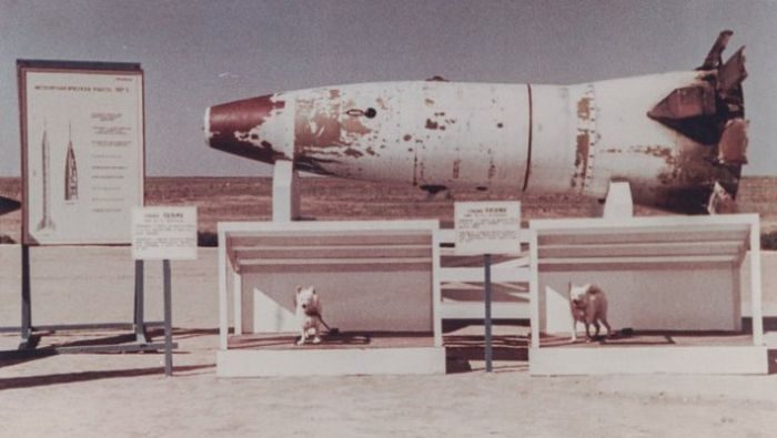 Головная часть ракеты Р-2А и две собаки-космонавта после возвращения на Землю