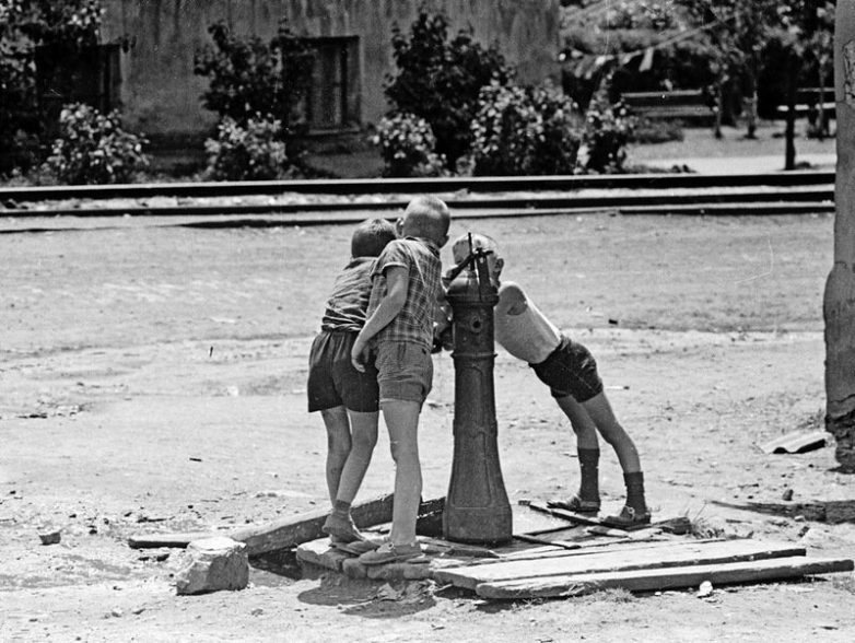 Пацаны у колонки с водой напомнили детство — попить, иной раз умыться или ноги помыть приходилось неоднократно.