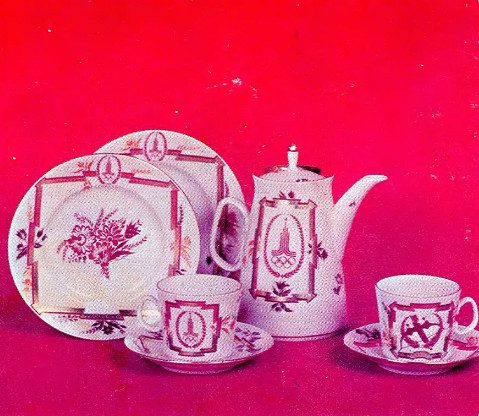 А как вам такой набор посуды? По мне так странновато олимпийские символы сочетаются со всеми этими цветочками. Если посмотреть на тарелку, то может сложиться впечатление, что «олимпийский» принт сделан поверх «цветочного».
