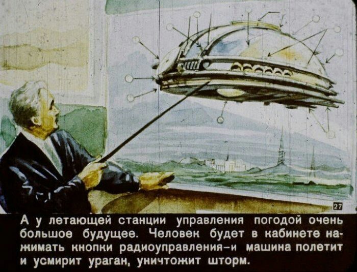 Для советского гражданина начала 1960-х было, по-видимому, совершенно очевидно, что через 50-60 лет его потомки смогут беспрепятственно и с точностью не только спрогнозировать погодные условия на ближайшее время, но и изменить ее по желанию. Так, в диафильме авторы изобразили летающую станцию управления погодой, которая не только способна временно изменить метеоусловия, но и даже спасти мир от разрушительных ураганов и цунами.