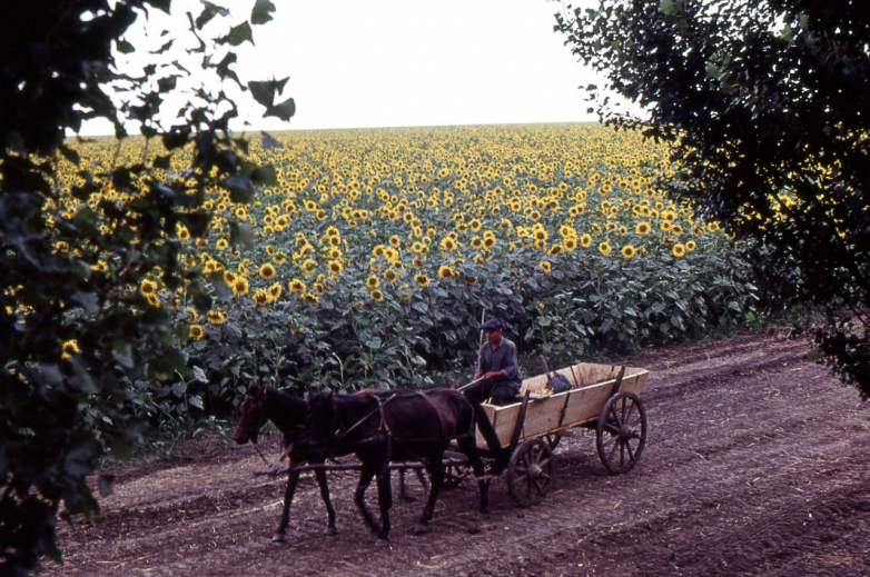 Молдавия. Крестьянин проезжает мимо поля подсолнухов в непосредственной близости от Кишинева.