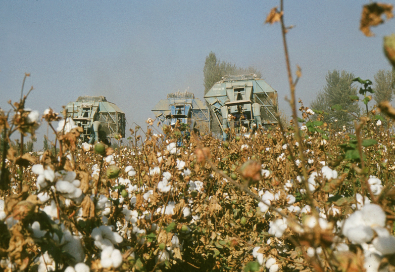 Окрестности Самарканда. Хлопкоуборочные комбайны за работой на поле специализированного совхоза.
