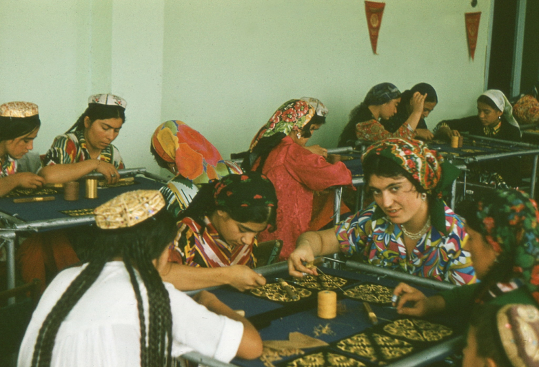 Самарканд. Молодые женщины на фабрике, специализирующейся на серебряной вышивке, делают «Тюбетейки», типичный узбекский головной убор.
