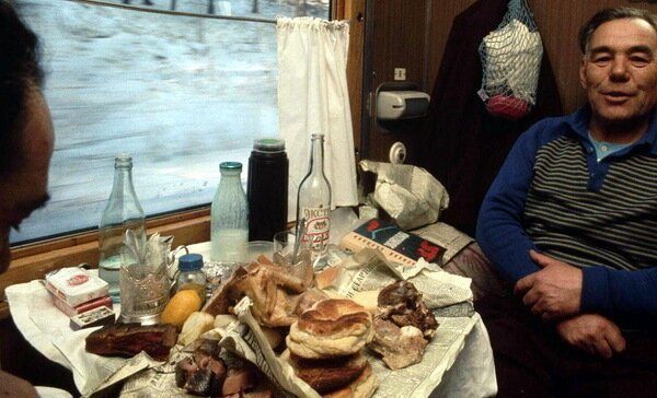 В поездах тогда выпивали с попутчиками, как на фото. Никто не запрещал, если не наглеть.
