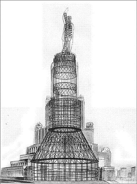 Как видите, вместо одной огромной башни с Лениным на вершине, целый комплекс зданий. Башня, впрочем, уже есть. Но ее венчает не Ильич, а освобожденный пролетарий с факелом.