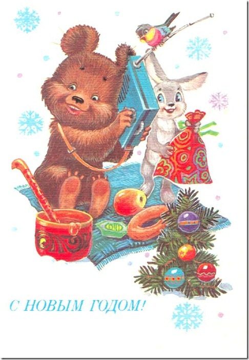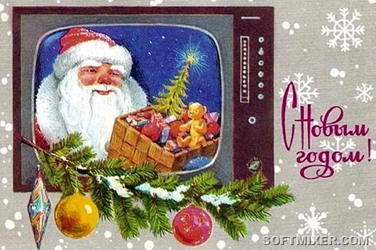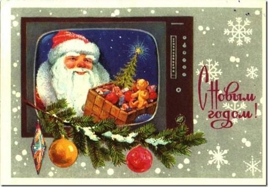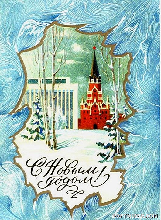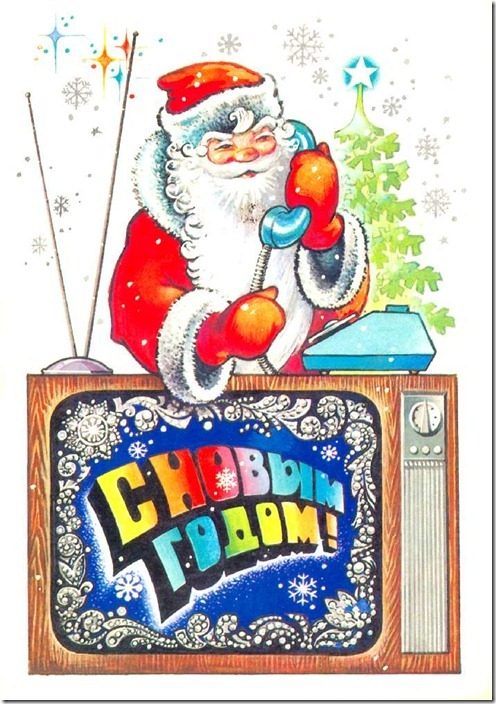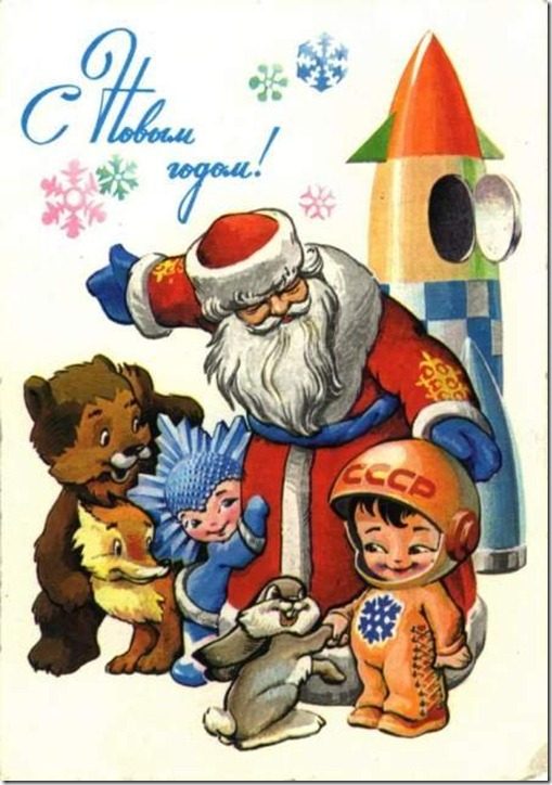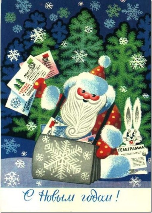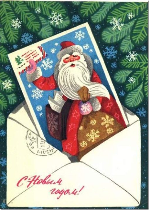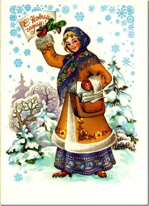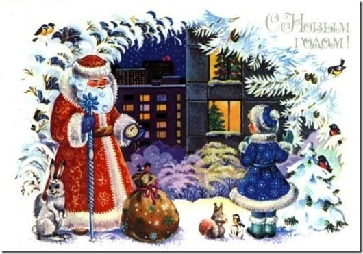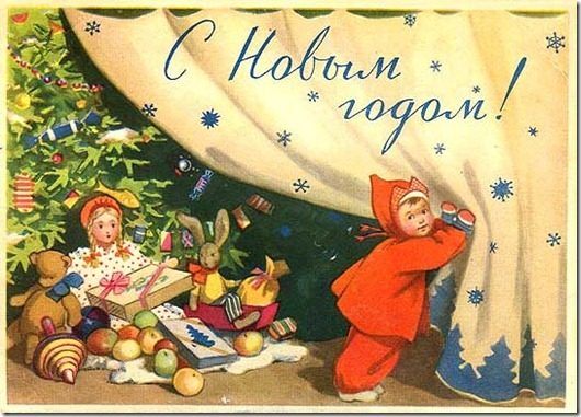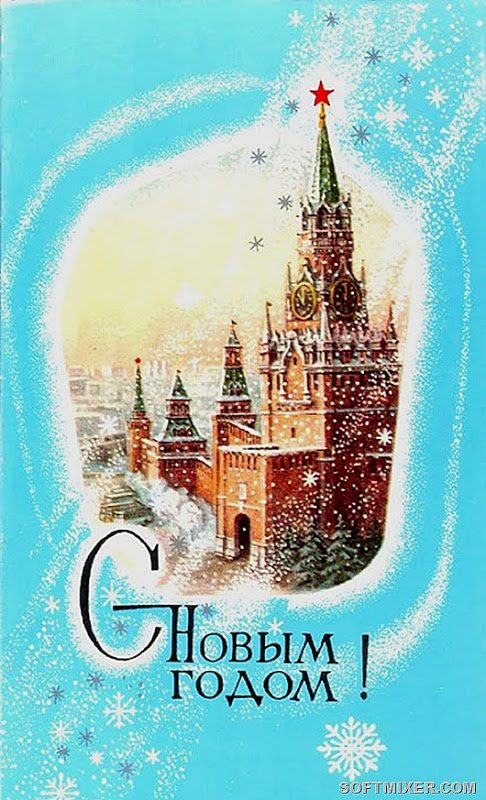 На первых советских новогодних открытках изображались счастливые мамы с ребятишками и башни Кремля, позднее к ним присоединились Дед Мороз и Снегурочка.