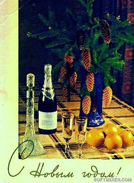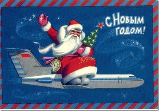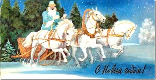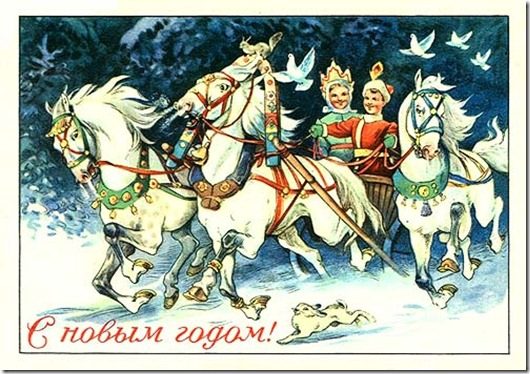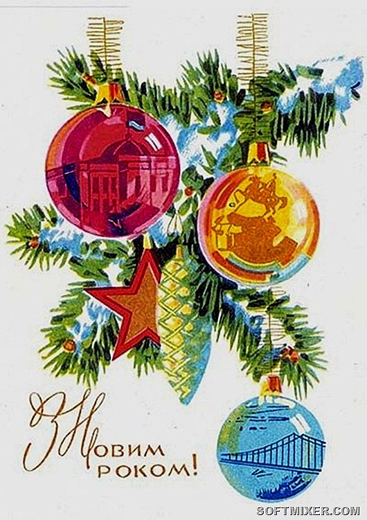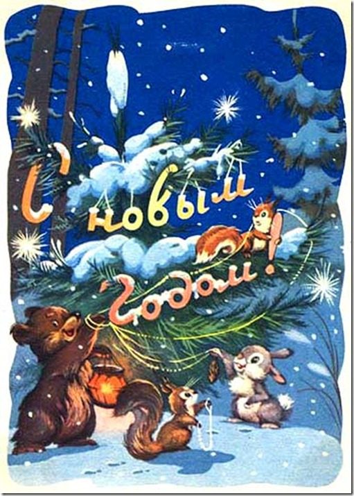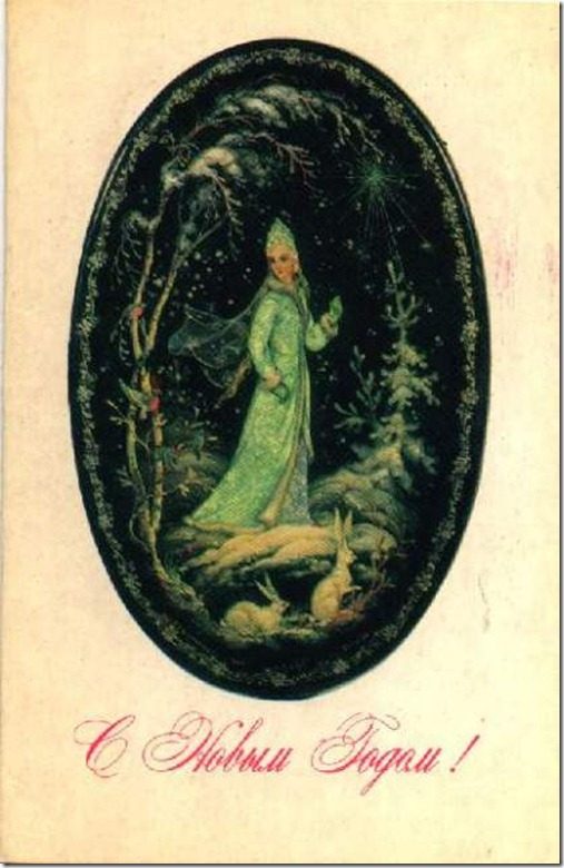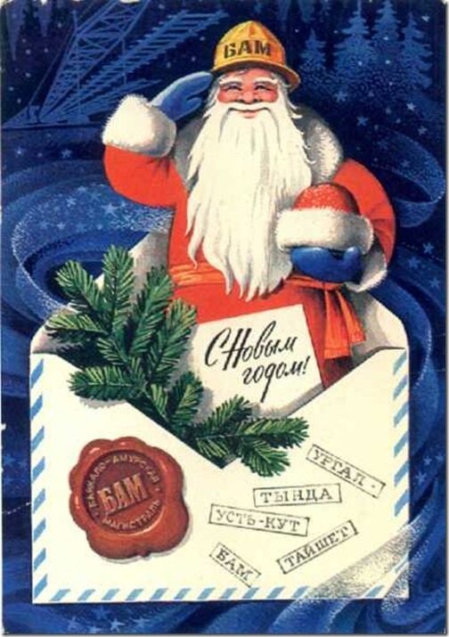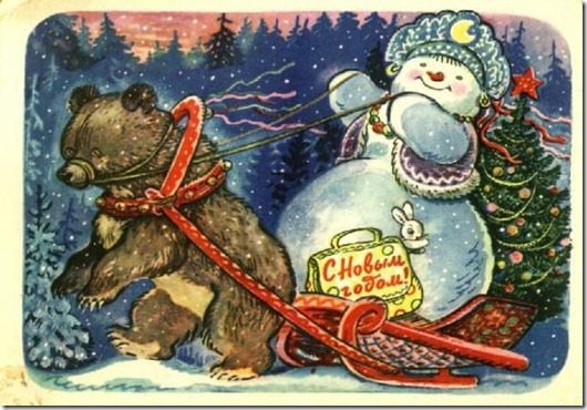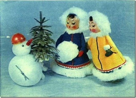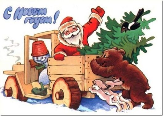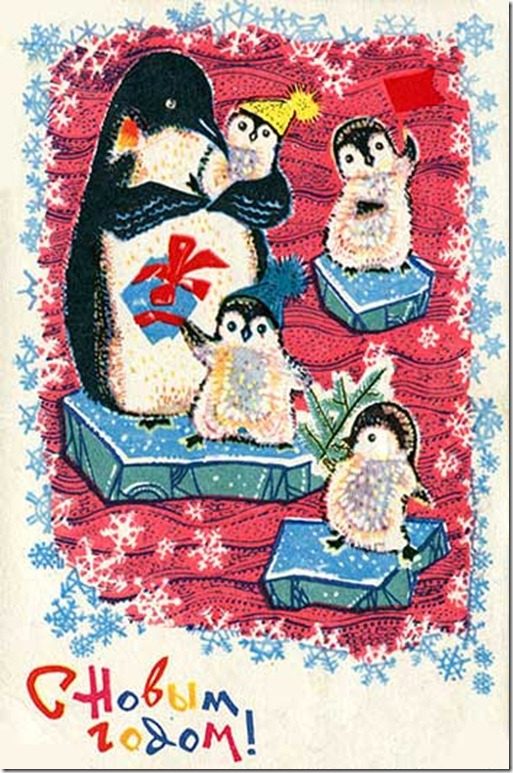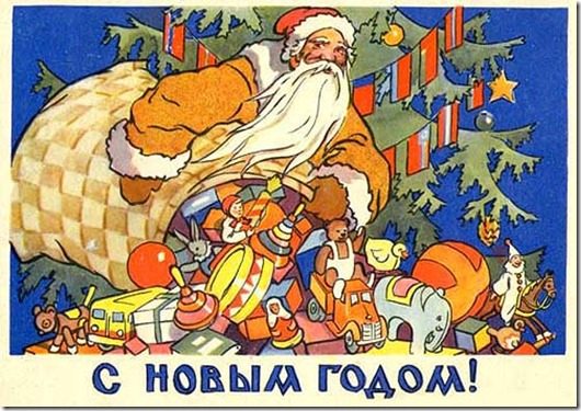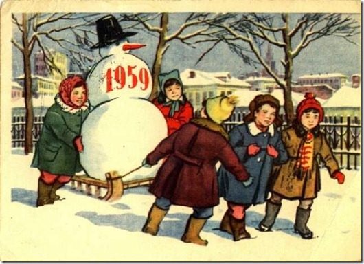 На первых советских новогодних открытках изображались счастливые мамы с ребятишками и башни Кремля, позднее к ним присоединились Дед Мороз и Снегурочка.
