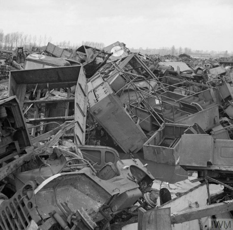 На переднем плане британские 17-фунтовые полевые орудия, за ними различные американские машины и немецкая артиллерия. Это оборудование было собрано для отправки через Ла-Манш для дальнейшей утилизации в Великобритании.
