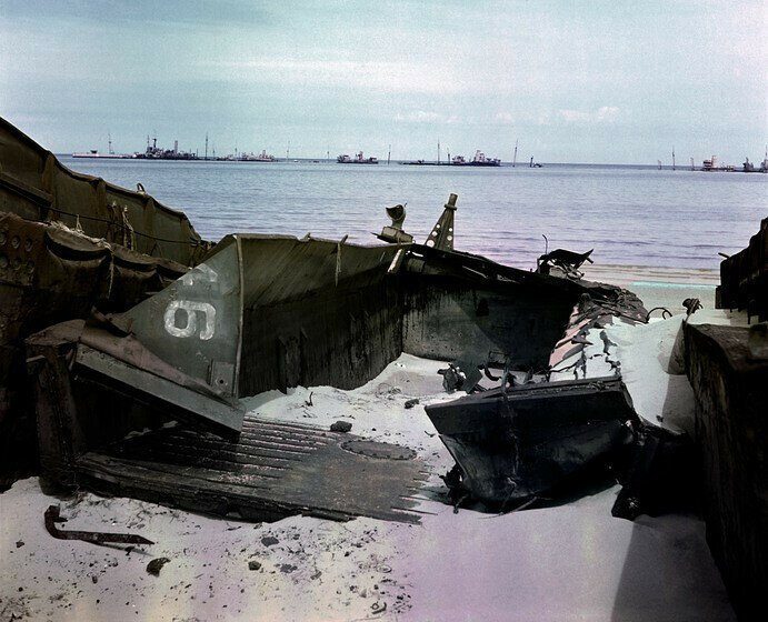 Пляж Омаха в Нормандии в 1947 году, через два года после Второй мировой войны и через три года после вторжения «Оверлорда» в этот день. Обломки до сих пор засоряют пляж, а вдали от берега остаются некоторые корабли искусственной гавани Малберри