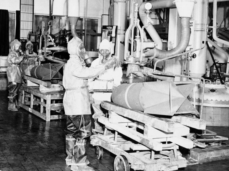 Немецкие рабочие в противогазах люфтваффе выкачивают горчичный газ из газовых бомб Люфтваффе