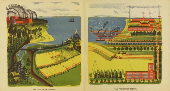 Разворот тетради с картинками «Что мы строим», в которой рассказывается о промышленности, сельском хозяйстве и природных ресурсах СССР, 1930 год