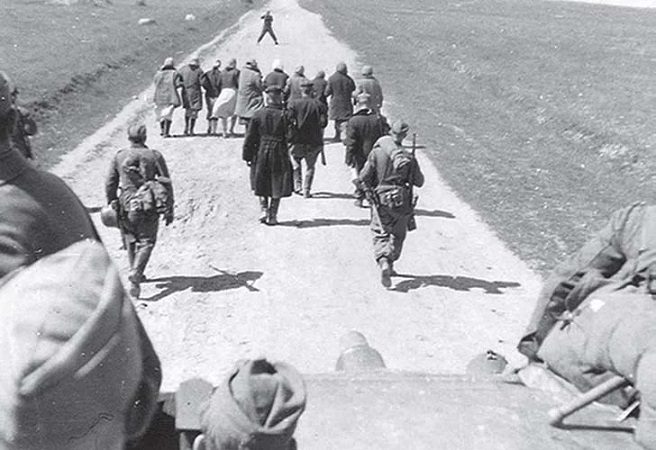 В добавок ко всему, гитлеровцы используют очень мерзкую и позорную для любого солдата тактику, впервые взятую ими на вооружение в Польше: гонят перед собой беззащитных женщин, детей и стариков, прячась за ними.