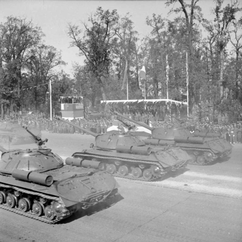 Союзники по Антигитлеровской коалиции — СССР, США, Англия и Франция — решили устроить совместный парад. Западные страны выставили легкую бронетехнику и свои достаточно новые танки. Англичан представлял крейсерский А34 Comet, американцев — легкие M24 Chaffee, у французов своей бронетехники вообще не было. Под занавес парада со стороны Колонны Победы по направлению к Бранденбургским воротам проследовала «коробка» из 52 настоящих монстров из состава 49-й гвардейской танковой бригады 2-й гвардейской танковой армии.