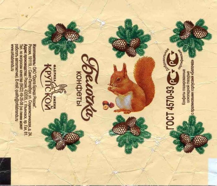 Это незатейливое название находилось на слуху у всех без исключения. В составе конфет был фундук, измельченный до состояния крошки. Потрясающе вкусная начинка была немного специфической, что существенно улучшала качество лакомства. На обертке была изображена белочка, держащая в лапках орешек. Многие годы дизайн фантиков оставался неизменным. Конфеты появились впервые в сороковых годах прошлого века. Делались они на кондитерской фабрике имени Крупской. На огромном предприятии за год производили не одну тысячу тонн конфет.