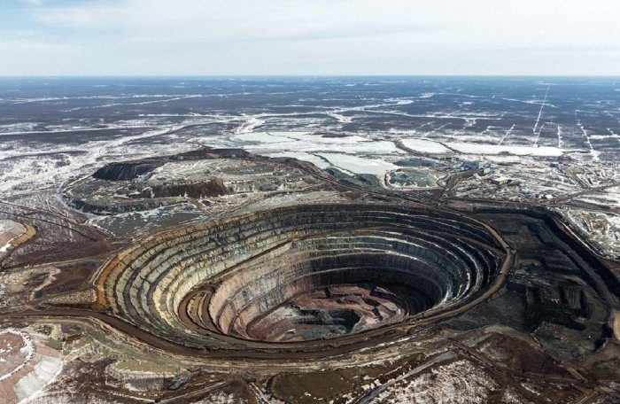 На фото алмазный якутский разрез. Вокруг кимберлитовой трубки. Название происходит от деревушки Кимберли в ЮАР, где находилось самое богатое месторождение алмазов в мире. Вокруг давно угасшего жерла вулкана. Кстати. Самый большой в мире разрез по глубине, не алмазный, угольный, находится в (простите, по помню точно, но с большой долей вероятности, в Америке). Второй-Коркино, Челябинская область.