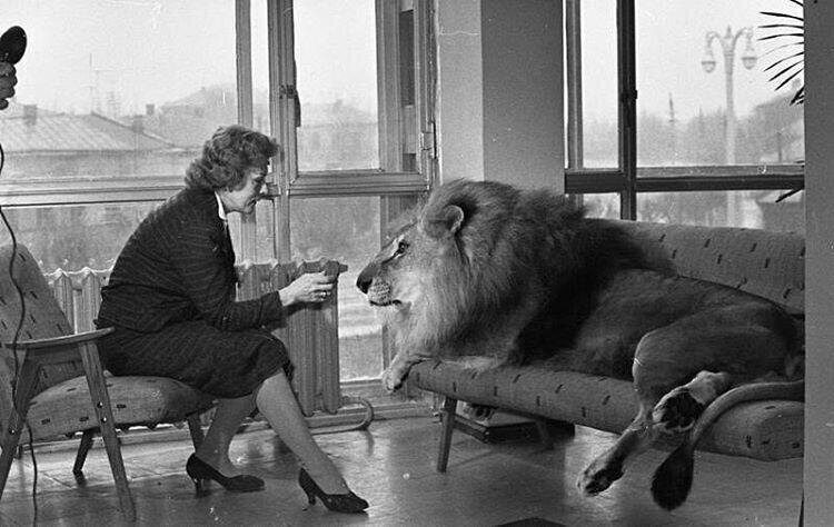 Дрессировщица Ирина Бугримова в холле со львом, 1962 – 1965 год