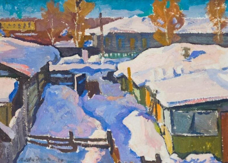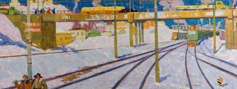 Я, конечно, не знаток живописи, но некоторые картины это какая-то унылая заказная мазня, такие как «Утро» А.М. Сорочкина. По сумеречному городу непрерывным потоком идут колонны порожних самосвалов, а им наперерез вынуждены двигаться люди из автобуса. Что ж так остановку-то вкорячили?