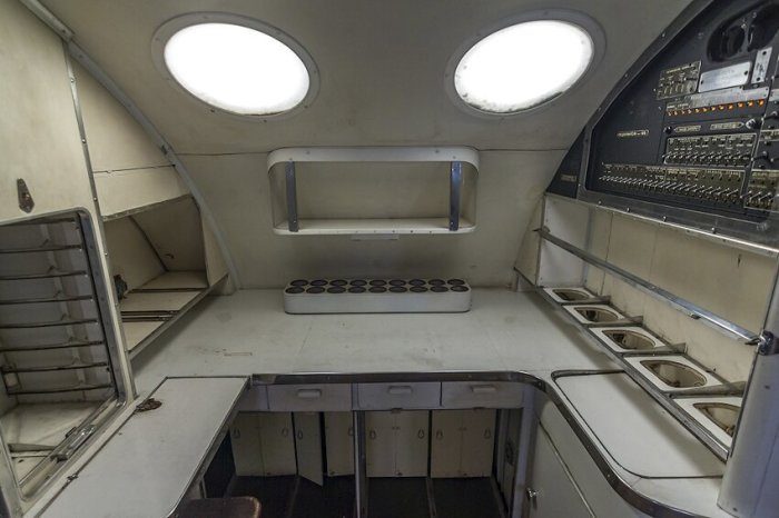 На борту Ту-114 имелось сразу три туалета. Уже одного взгляда на фотографию будет достаточно для того, чтобы понять – каждый из них в среднем намного лучше тех санузлов, которые имеются в современных лайнерах. Примечательно, что туалеты на 114-ом делились на мужские и женские, а также располагались в хвостовой части самолета. Внутри каждого санузла – непривычный простор.