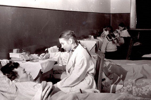Учащиеся школы № 6 г.Калинина пишут письма домой под диктовку раненых бойцов, находящихся на излечении в госпитале. 1943 г. Калинин.