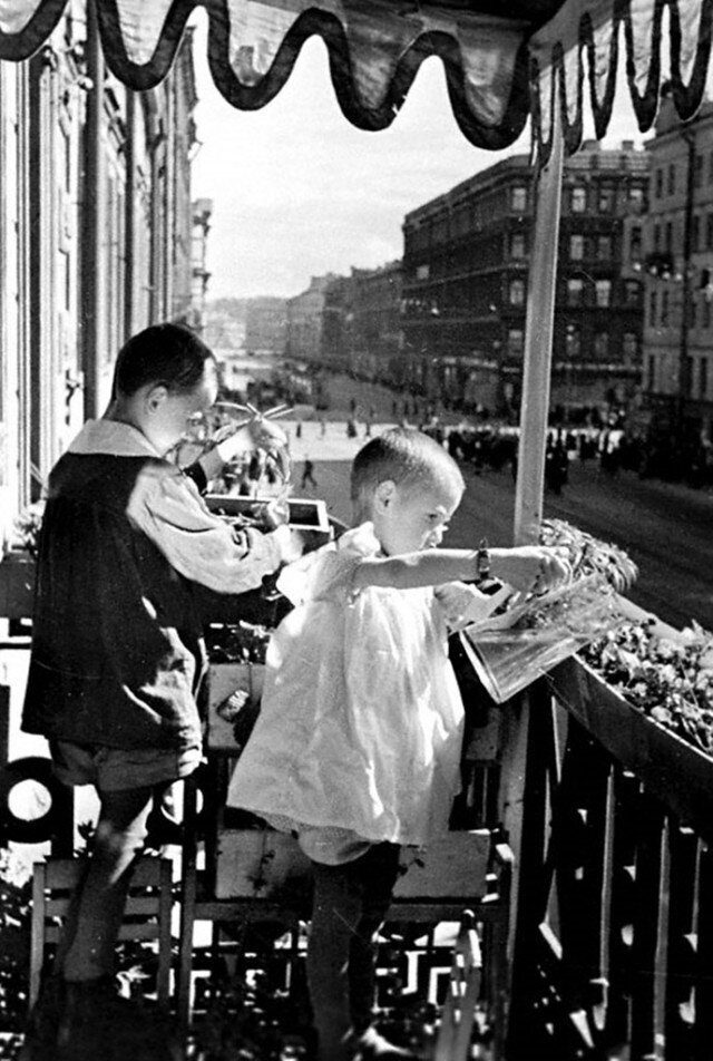 Дети Г.Сухарев и Т.Хабаева поливают овощи на балконе детского дома Куйбышевского района по проспекту Володарского. 1942 г. Ленинград.