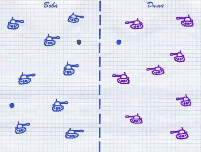 Игра на меткость зрения и смекалку. Берем лист А4 или просто тетрадный. Складываем его пополам. И рисуем на поле танчики. С одной стороны листа — танки одного игрока, с другой — другого. Рисуем в произвольном месте на своем поле гранату — жирную точку — и сворачиваем лист пополам. Посильнее прижимаем, чтобы чернила отпечатались на поле противника. Разворачиваем лист и любуемся результатом — убили мы танк или нет.