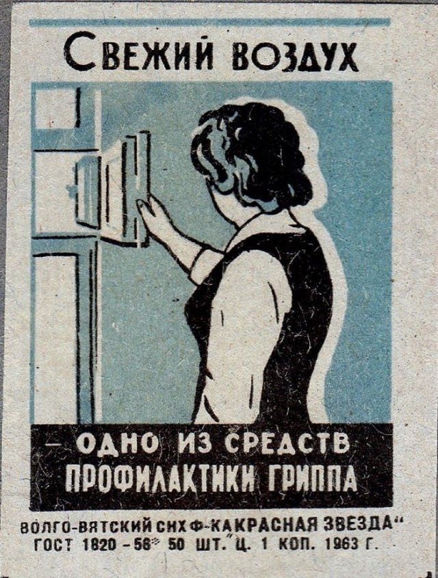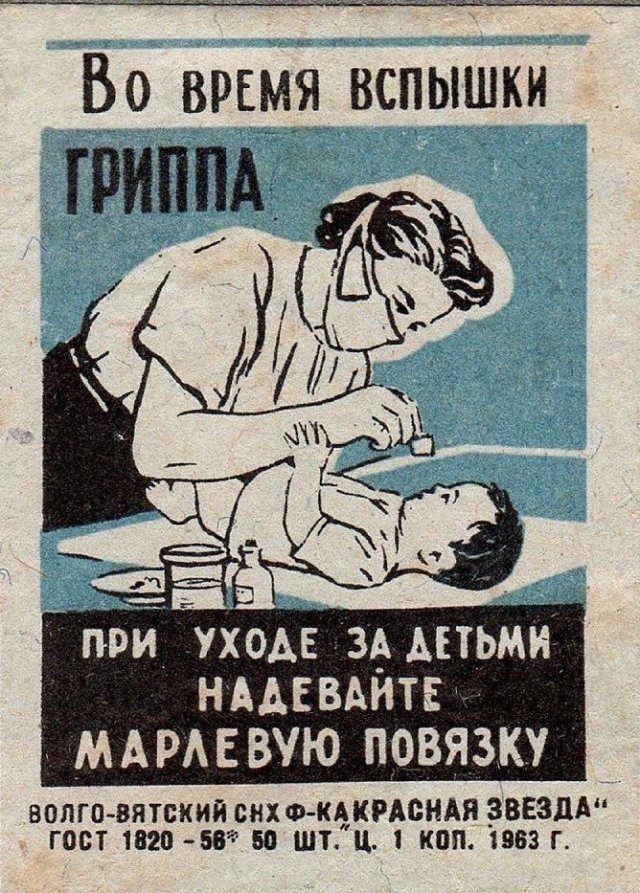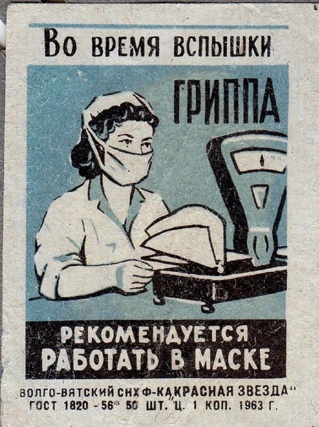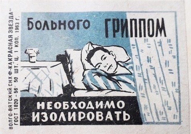 В 1960-х годах в СССР появилось несколько серий спичечных этикеток по теме вспышек и профилактики гриппа. Эти рекомендации распространялись по самым разным уголкам страны и информировали большинство граждан о том, как надо вести себя, чтобы не заразиться. Как они актуальны в наше время!