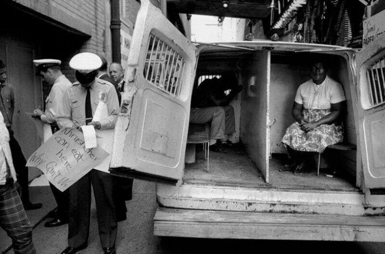 Надпись на плакате: «Если Хрущев может здесь есть, то почему этого не можем делать мы?» Афроамериканцы протестуют против запрета посещений чернокожими заведений, предназначенных для белых, ссылаясь на Хрущёва.