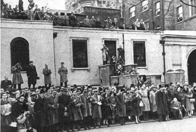 В апреле 1956 году Хрущёв и Булганин на крейсере «Орджоникидзе» отправились из Калининграда в Англию.Это лондонцы встречают советскую делегацию.