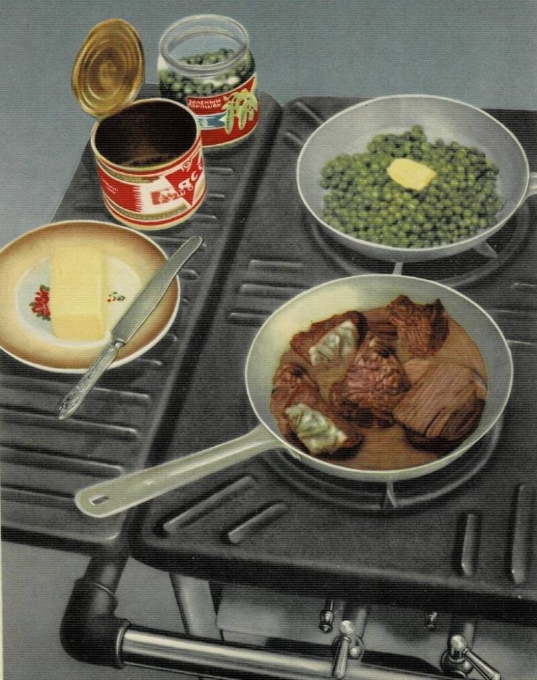 Иллюстрация из книги «О вкусной и здоровой пище». И прямо-таки мой обед. Во всяком случае где-то до 1962 года все именно так и было. Потом гречка постепенно стала редкостью. Часто в готовке использовались полуфабрикаты. Кисель, во всяком случае, у нас был именно такой.