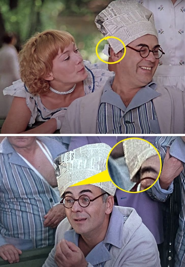 У Хоботова порванная шапочка из газеты склеена скотчем. Вот только клейкая лента появилась в СССР не в 1950-х годах, когда разворачивается действие фильма, а гораздо позже.