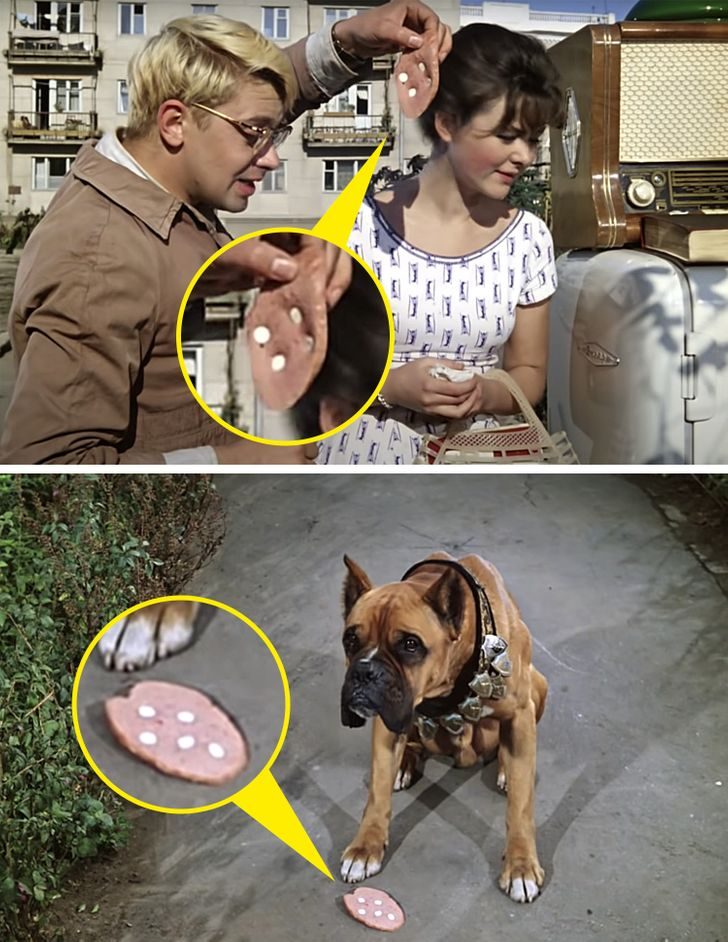 Шурик «превращает» «Докторскую» колбасу в «Любительскую», вставляя в ломтик 4 таблетки снотворного. Однако, когда он кидает его собаке, в нем оказывается уже 5 таблеток.
