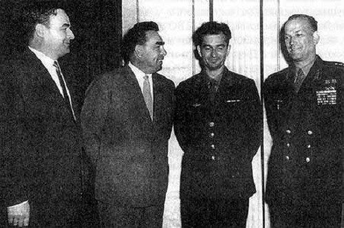 В СТРОКУ НЕ УБРАЛОСЬ, ДУБЛИРУЮ: Фотография, сделанная в Кремле 14 июля 1960 г. после вручения капитану Василию Амвросиевичу Полякову ордена Боевого Красного Знамени. Слева направо: секретать Президиума Верховного Совета СССР Георгадзе, Председатель Президиума — Брежнев, капитан Поляков, генерал-полковник Савицкий, командующий авиацией ПВО.