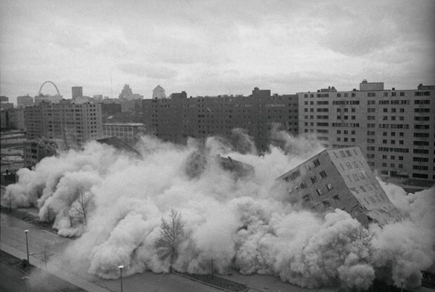 В 1970 году сент-луисский комплекс социального жилья «Прюит-Игоу» официально признается зоной бедствия. Да, здесь не было ни наводнения, ни пожара, ни торнадо — тут все гораздо хуже. Ни один из проектов реконструкции комплекса и спасения его жителей не признан в городской администрации эффективным. Коммуникации рушатся на глазах, провести ремонт и реконструкцию с учетом местных особенностей не представляется возможным. И власти принимают единственное приемлемое решение.Жильцов начинают расселять, направляя их в другое социальное жилье — обычно это один-два небольших дома в относительно приличных районах. Потом полиция и армия проводят рейд по выселенной башне, отлавливая там бомжей и наркоманов, башню оцепляет кордон, и ее взрывают.