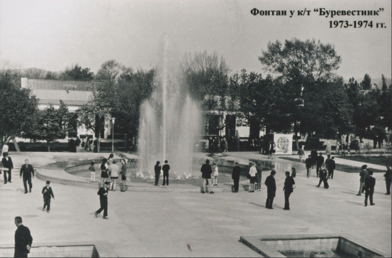 На месте этого фонтана сейчас совершенно другой фонтан. А кинотеатр Буревестник, он не попал в кадр, сохранился.