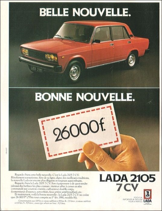 Ну не только «Лады» поставлялись за рубеж. «Москвичи» и «Волги» тоже. В 1976 году наш корабль был с визитом в г.Бордо во Франции. Там, гуляя по городу, мы набрели на автосалон, где продавали и «Ладу» и «Москвича». В середине 80-х один из сослуживцев побывав в долгосрочной командировке во Франции, вернулся домой купив там «Волгу» ГАЗ-24 с дизельным двигателем. Так что не только «лады» за границу продавали, и не только в соц. страны.