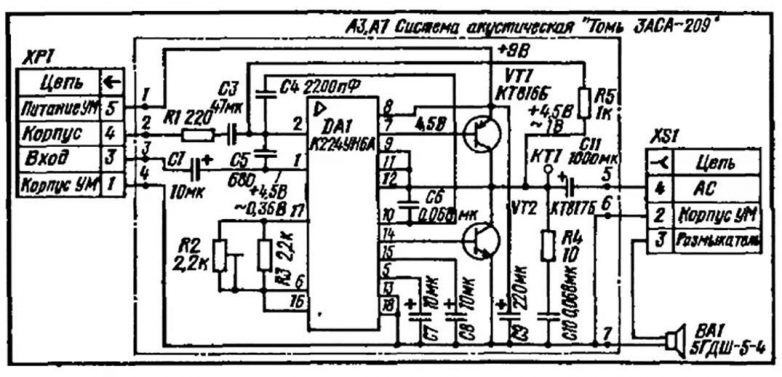 Для экономии места в центральном модуле магнитолы, усилители вынесли в корпуса колонок. При питании от батарей, для экономии, мощность снижалась до 1,5 Вт. При питании от сети выходная мощность повышалась до 5 Вт.