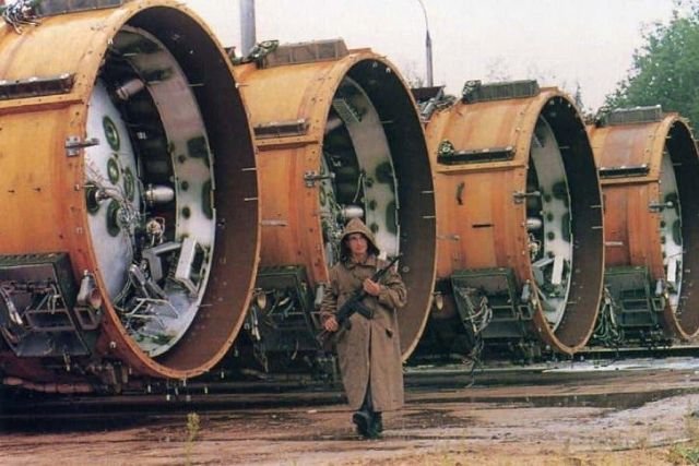 Часовой охраняет баллистические ракеты, подлежащие уничтожению в соответствии с договором о разоружении с США. СССР. 1987 год