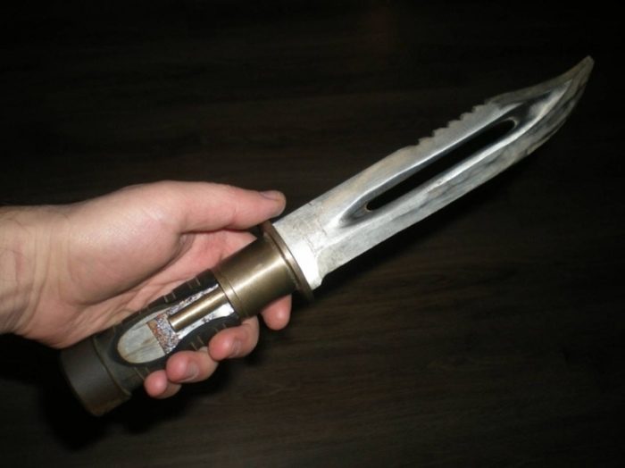 Мой приятель, слесарь-инструментальщик опытного производства, одно время загорелся идеей ртутного ножа и сотворил несколько вариантов оного. Для ртути я ему принес бракованный ртутный игнитрон. С полгода он «горел» этой идеей, но толку не получилось и он забросил эксперименты в конце концов. Потом новая мысля его посетила — стреляющая ручка под мелкашечный патрон. Сделал. Много лет этот «шедевр» провалялся у него в верстаке, пока случайно прострелил себе руку. Ох и потаскали его с этой поделкой, хорошо не посадили.